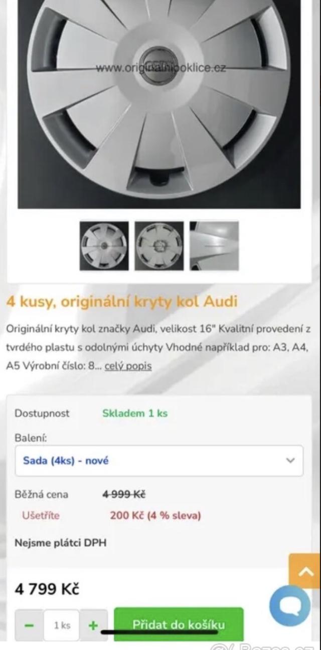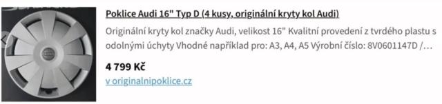 VÝPRODEJ nepoužité orig. poklice - AUDI - 16” sada 4ksProdám originální poklice AUDI ve velikosti 16” číslo orig. dílu: 8V0 .601 .174 .D, .lze použit na většinu plechových disky ve velikosti 16”. Uvedena cena je za 4ks. Možné zaslání. |